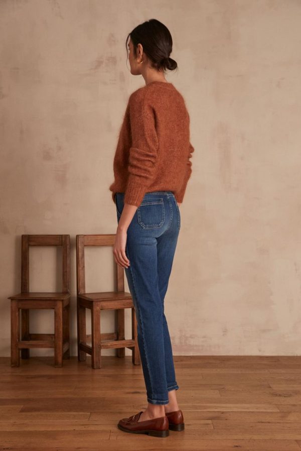Lucan mesure 1m76 et porte une taille 36. Avec le jean chino NALLA, la mannequin porte la chemise MORA, le pull ACAJOU, la ceinture SALOME et les bottines LOUIS.