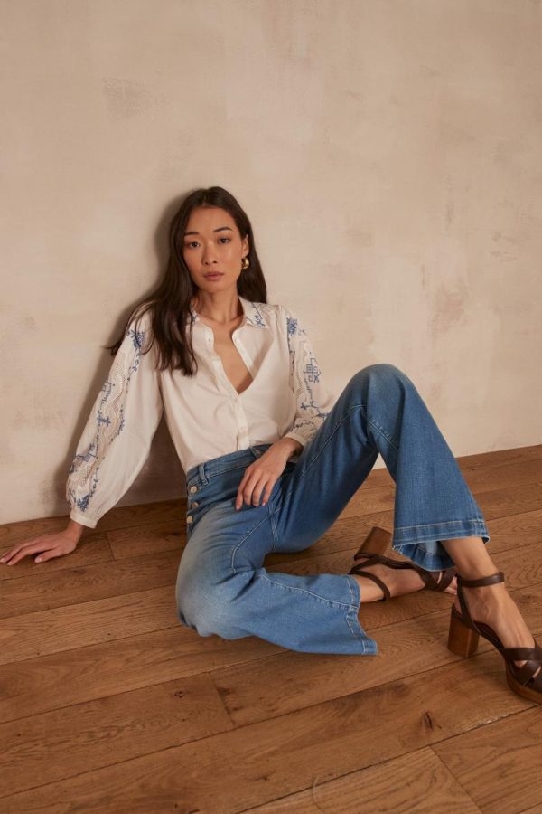 Ambiance seventies pour le jean NINON flare aux allures de pantalon de marin.