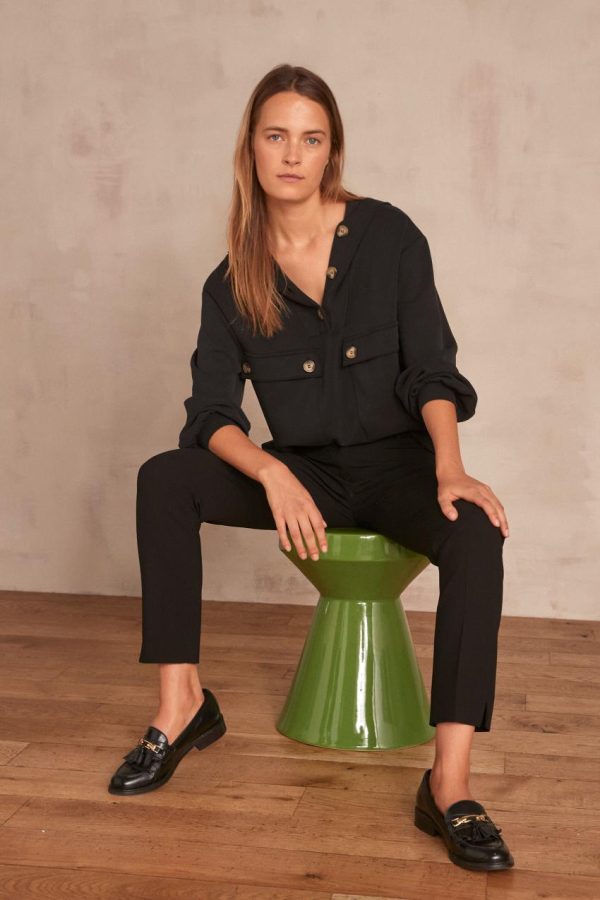 Esti mesure 1m76 et porte une taille 36. Avec le pantalon VALERO, la mannequin porte le sweat-shirt CADIX et les mocassins LISON.