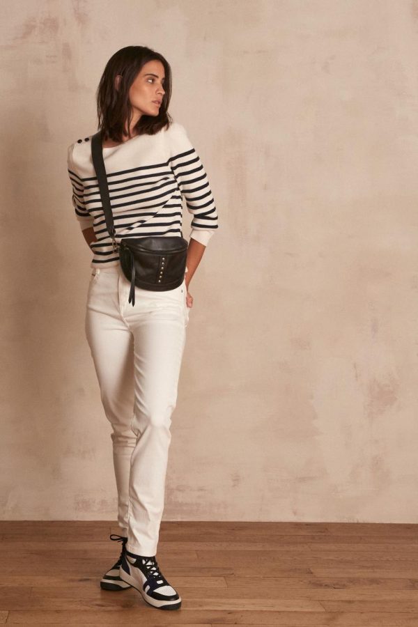 Pilar mesure 1m73 et porte une taille S. Avec le pull PREPPY, la mannequin porte le pantalon SULTAN, la banane GHOST et les baskets LUCAS.