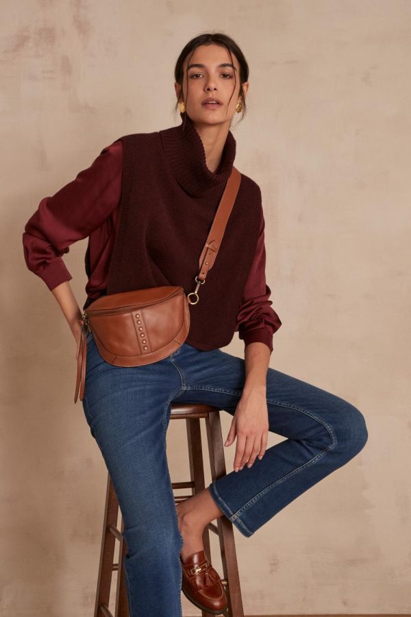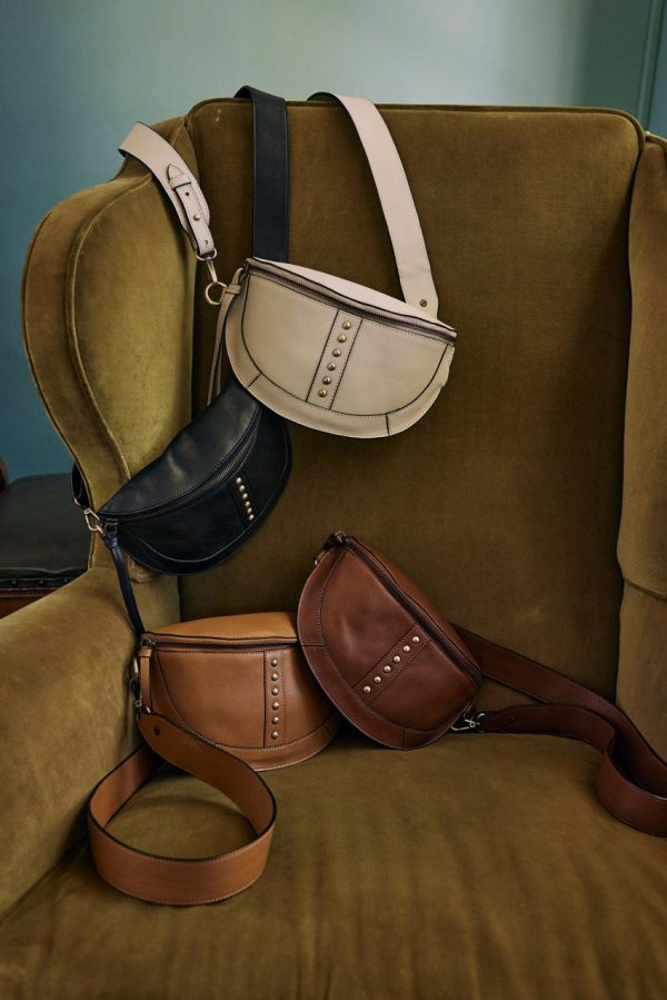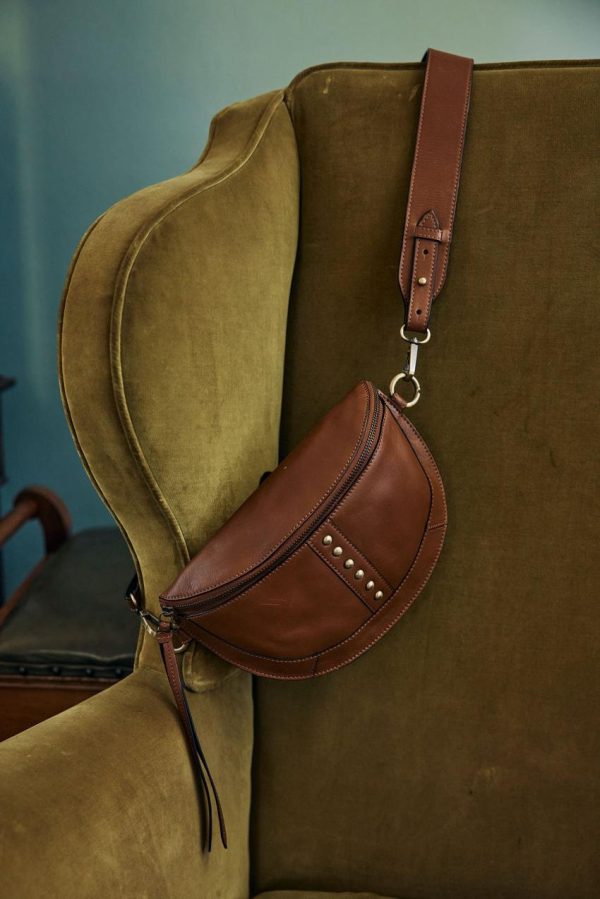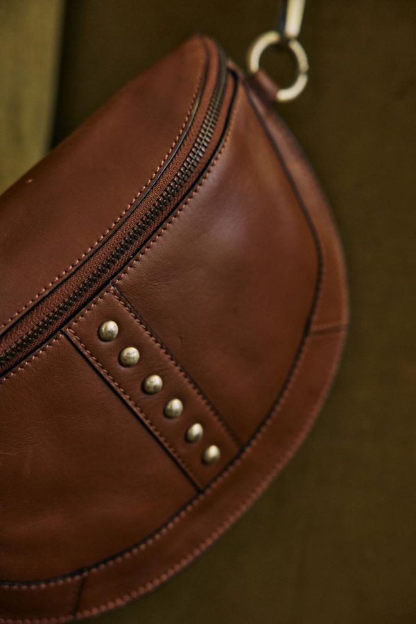 Adoptant cette forme arrondie significative, cette banane se veut pratique et élégante. Confectionné dans un cuir épais et un brin rigide, elle durera dans le temps. On note sa rangée de clous vieillis et sa bandoulière réglable.