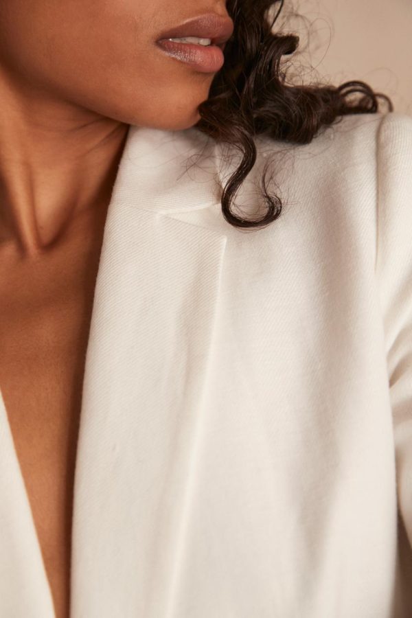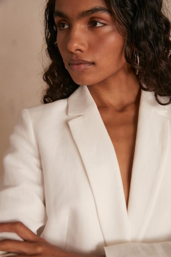 WE CARE : Cette veste est confectionnée à partir de lin recyclé. Découvrez l’élégante veste de tailleur en lin ARLENE dans une teinte immaculée.
