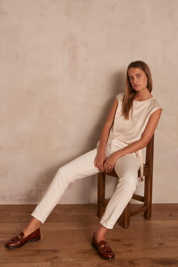 Esti mesure 1m76 et porte une taille 36. Avec le pantalon SABIL, la mannequin porte le top HONORE et les mocassins LISON.