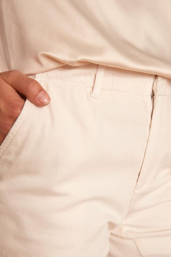Sa coupe chino sophistiquée et sa taille élastiquée s’adaptent avec grâce à toutes les silhouettes. Confectionné en coton précieux, sa texture offre une sensation plus voluptueuse que le denim. Indispensable pour les mi-saisons, sa couleur crème sublime toutes les tenues.